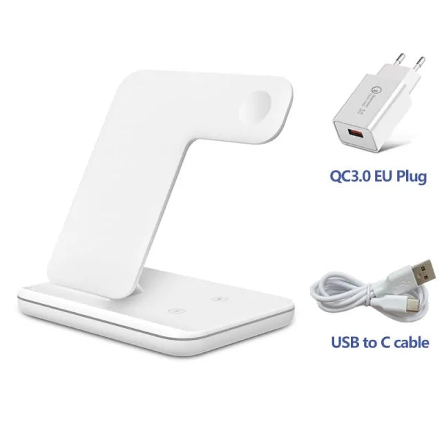 Imagine a world where all your devices are charged and ready without the hassle of multiple cables. This 3 in 1 wireless charging stand makes that possible, offering a seamless and convenient charging experience for your smartphone, smartwatch, and earbuds all at once.