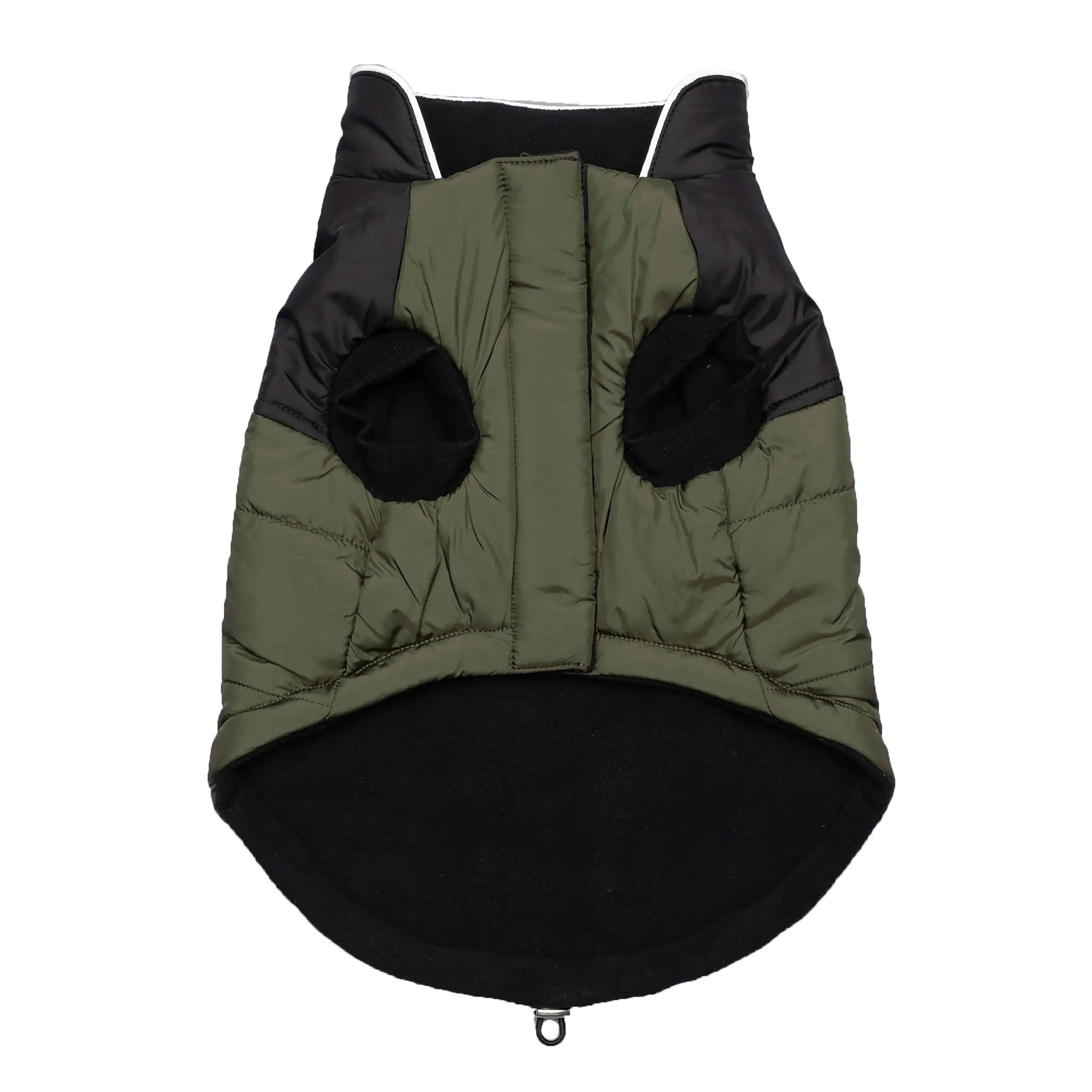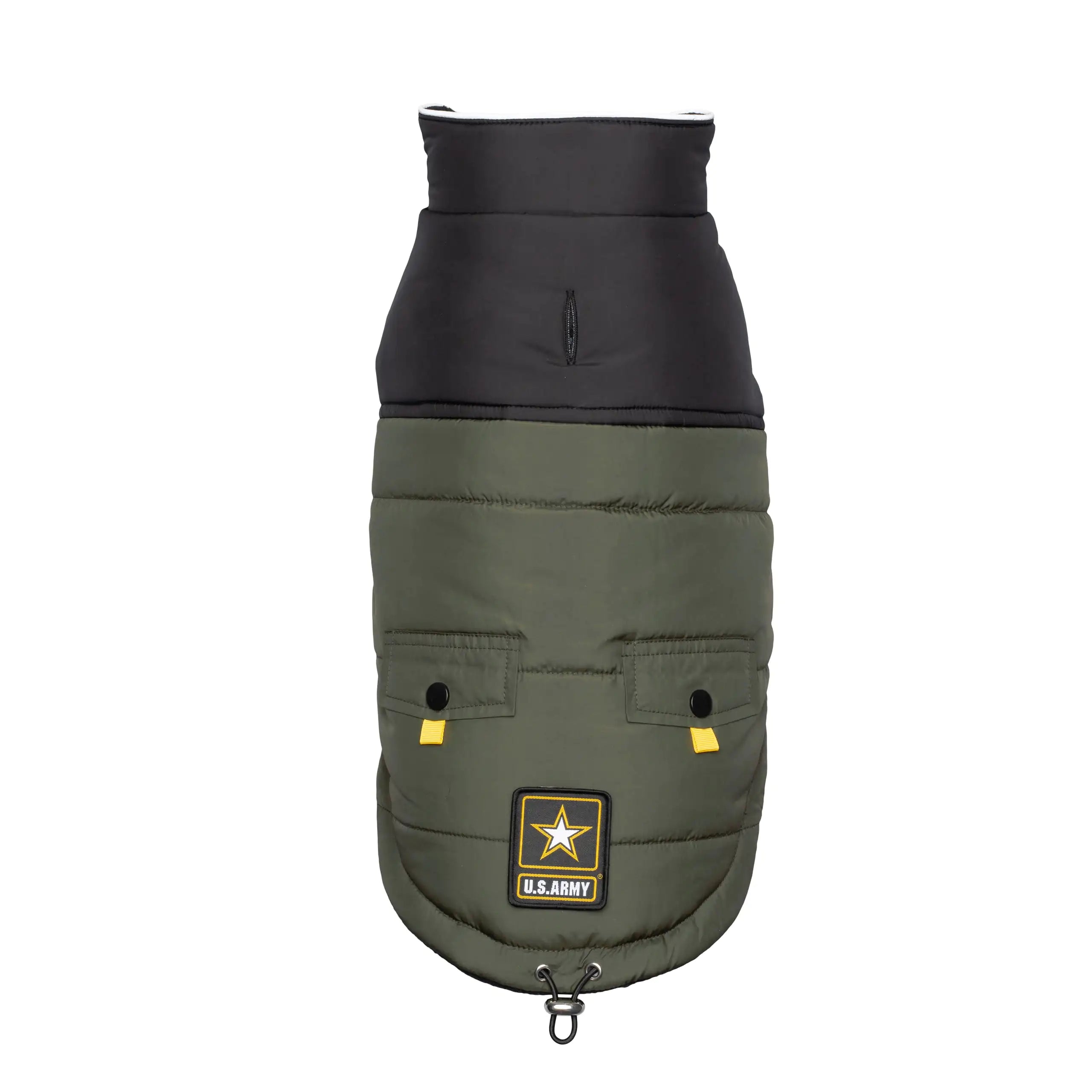 This official licensed US Army® Dog Jacket is the best match for sporty dogs. Its 2-tone design and polar fleece lining will keep your dog warm in any adventure! With its reflective piping, faux pockets and a convenient leash hole, this great value dog coat is the perfect patriotic statement for your active pooch! Fit your dog easily through the front velcro closure and adjust the bungee cord. Camo (army camouflage print) with yellow detail and official US Army logo patch.